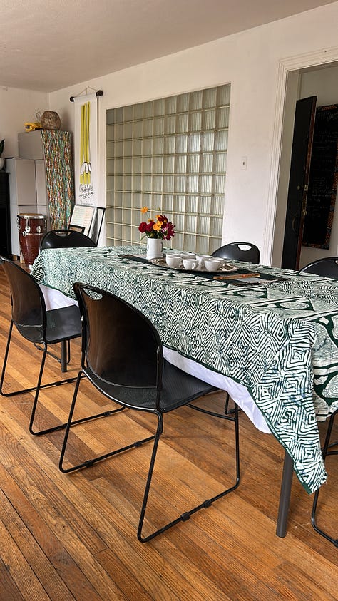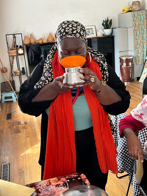 I welcomed Ebony and and her cohort of artists into the Nzinga Durham capoeira house not too far from Hayti. The coffee ceremony table was set with african fabrics, flowers I’d harvested from the backyard garden, and incense. We sat around and shared our first experiences with coffee. Many of us were introduced to coffee by our grandmothers, and regaled childhood kitchen table conversations with elders as we sipped a coffee blend sourced and grown by Black hands2.